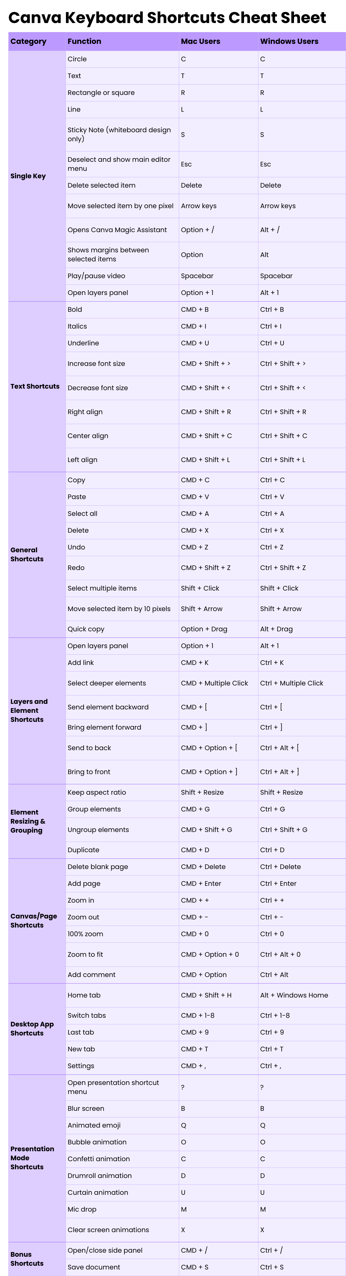 Canva Keyboard Shortcuts Cheat Sheet ⌨️